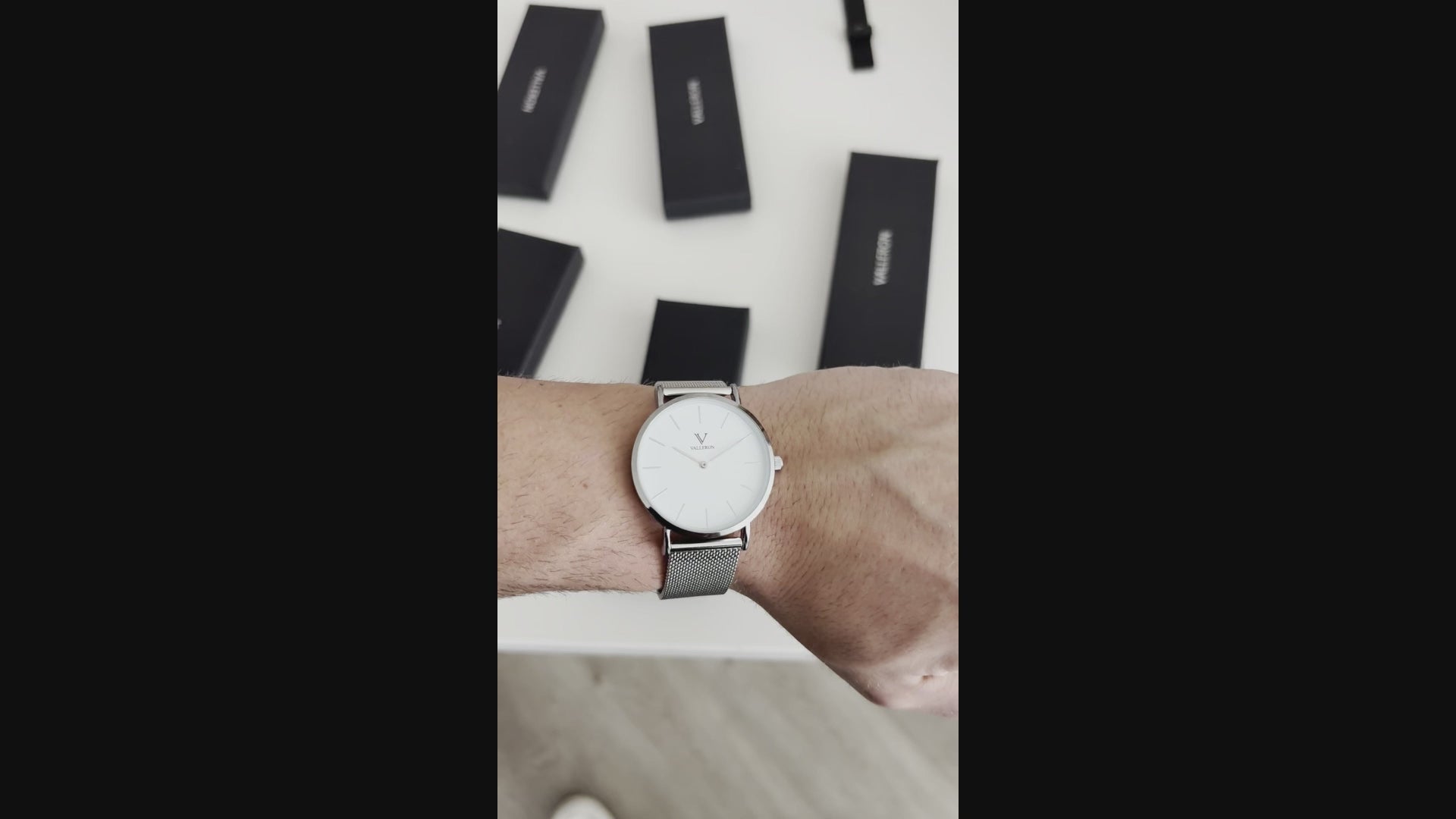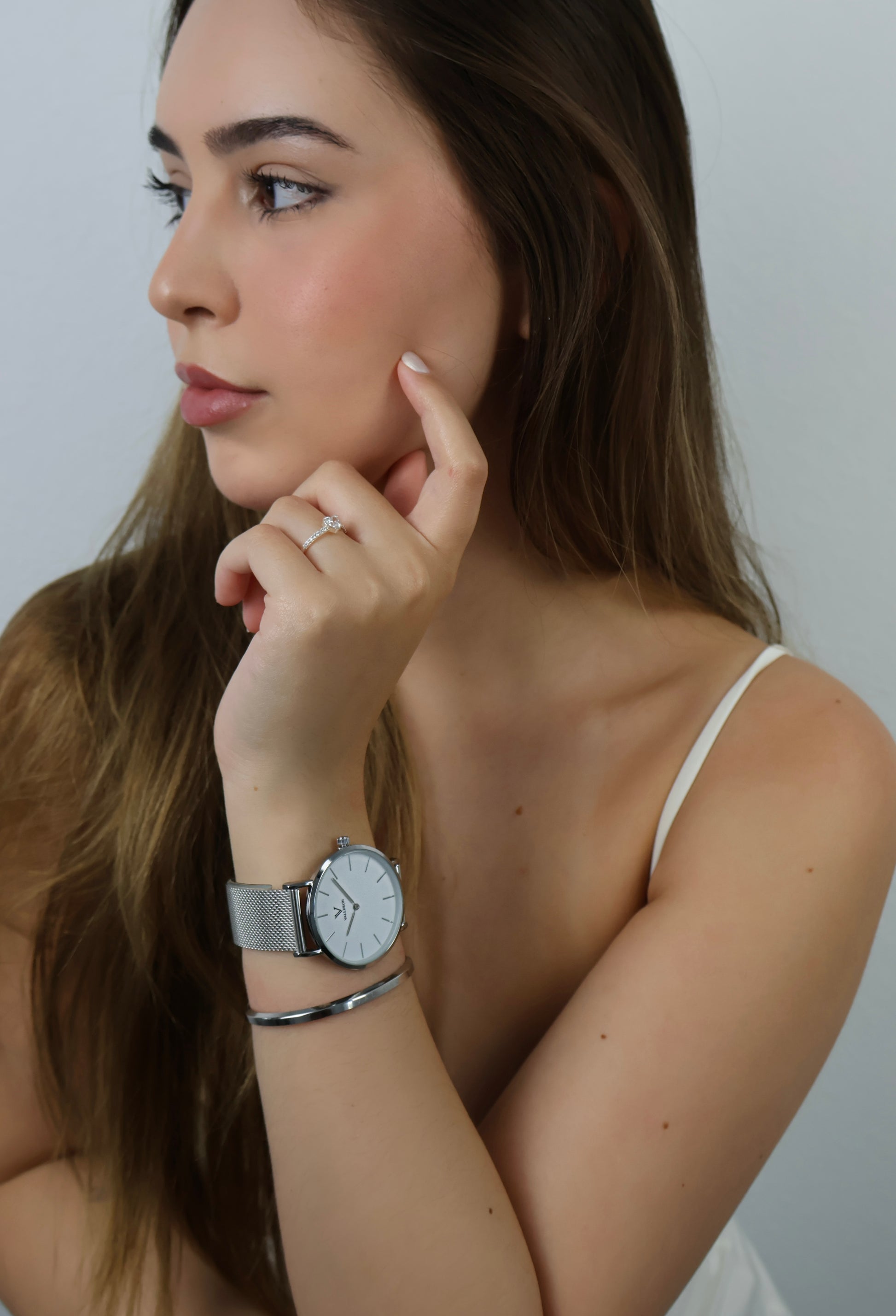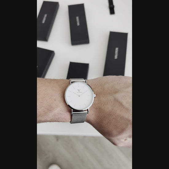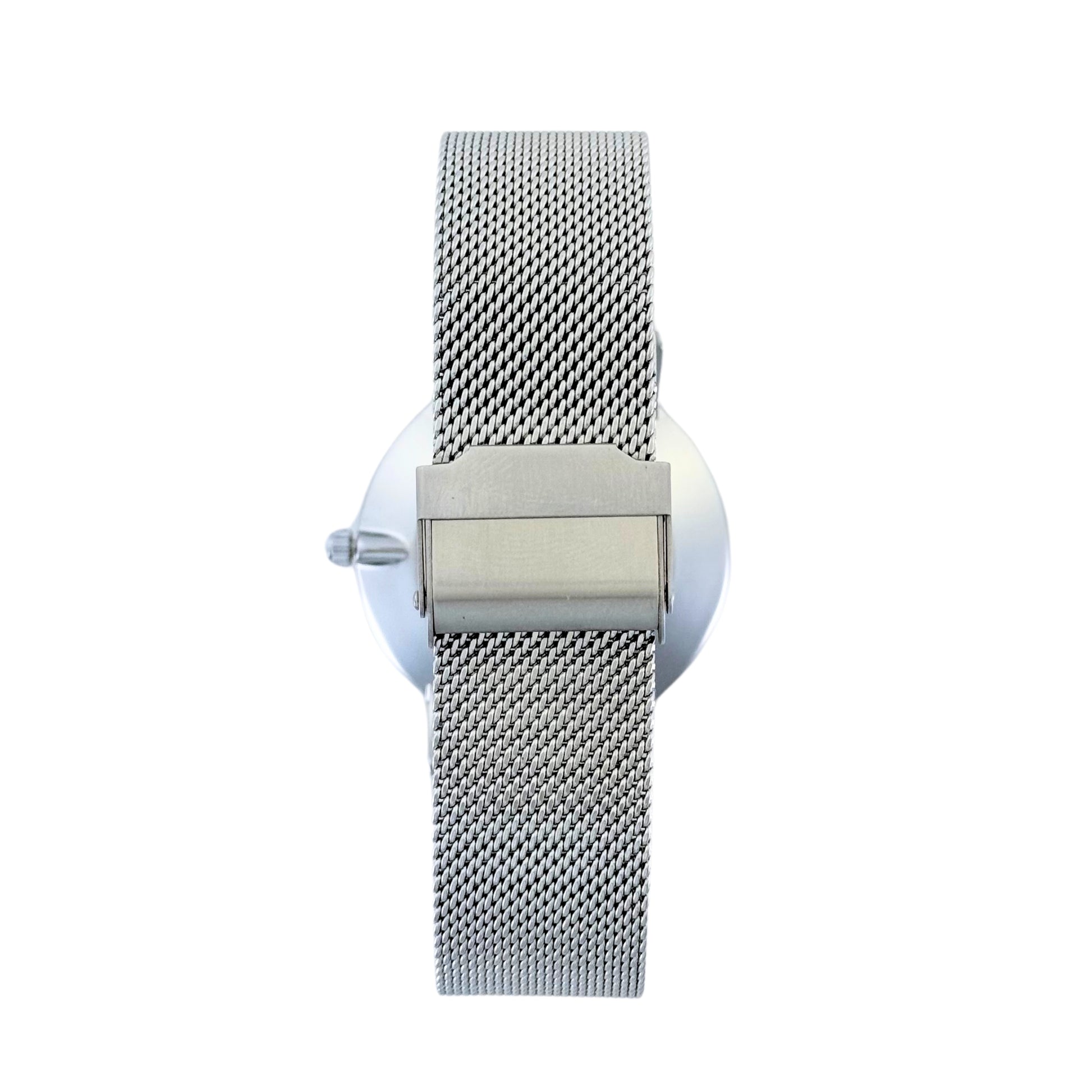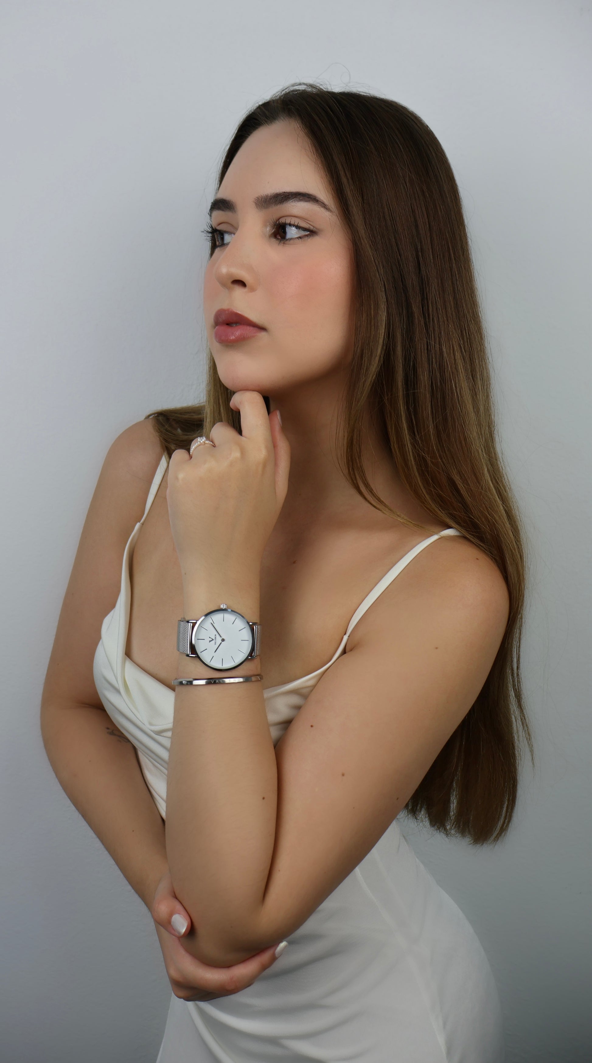 The case is made of silver metal and the dial is white, with glass made of high-resistance hardened mineral. This watch is ready for you to go from the office to the rooftop party in the blink of an eye.