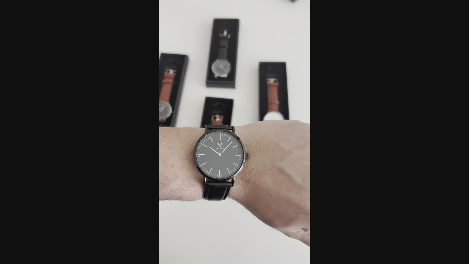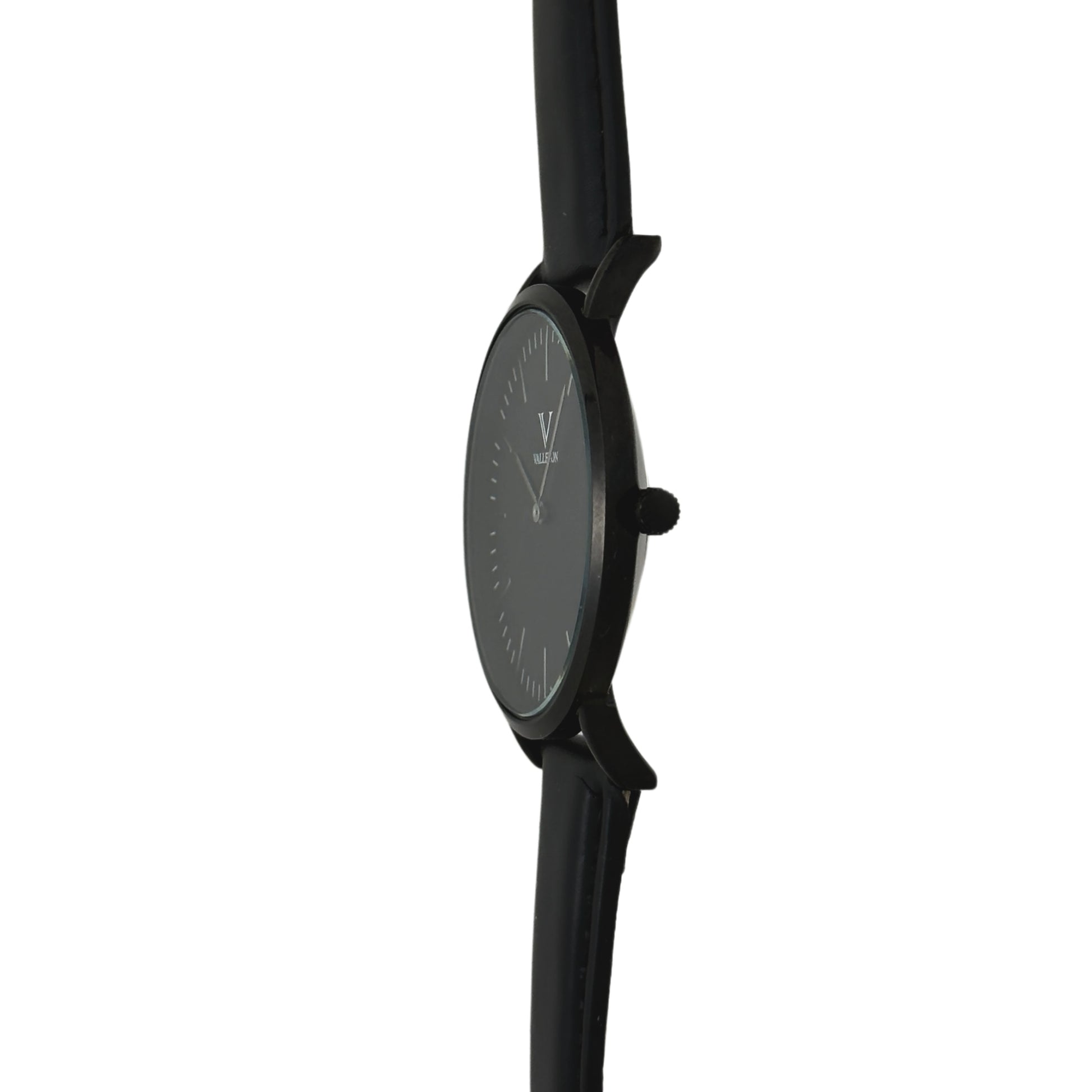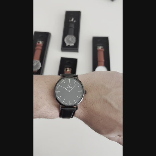 Le Mans Full Black 40mm Valleron Watch with black leather strap, has a diameter of 40mm. The case is made of black metal and the dial is black, with glass made of high-resistance hardened mineral.This watch is ready for you to go from the office to the rooftop party in the blink of an eye.