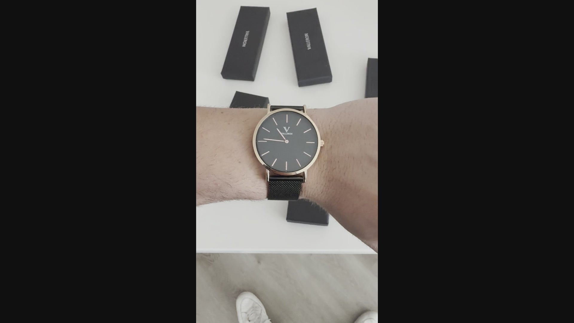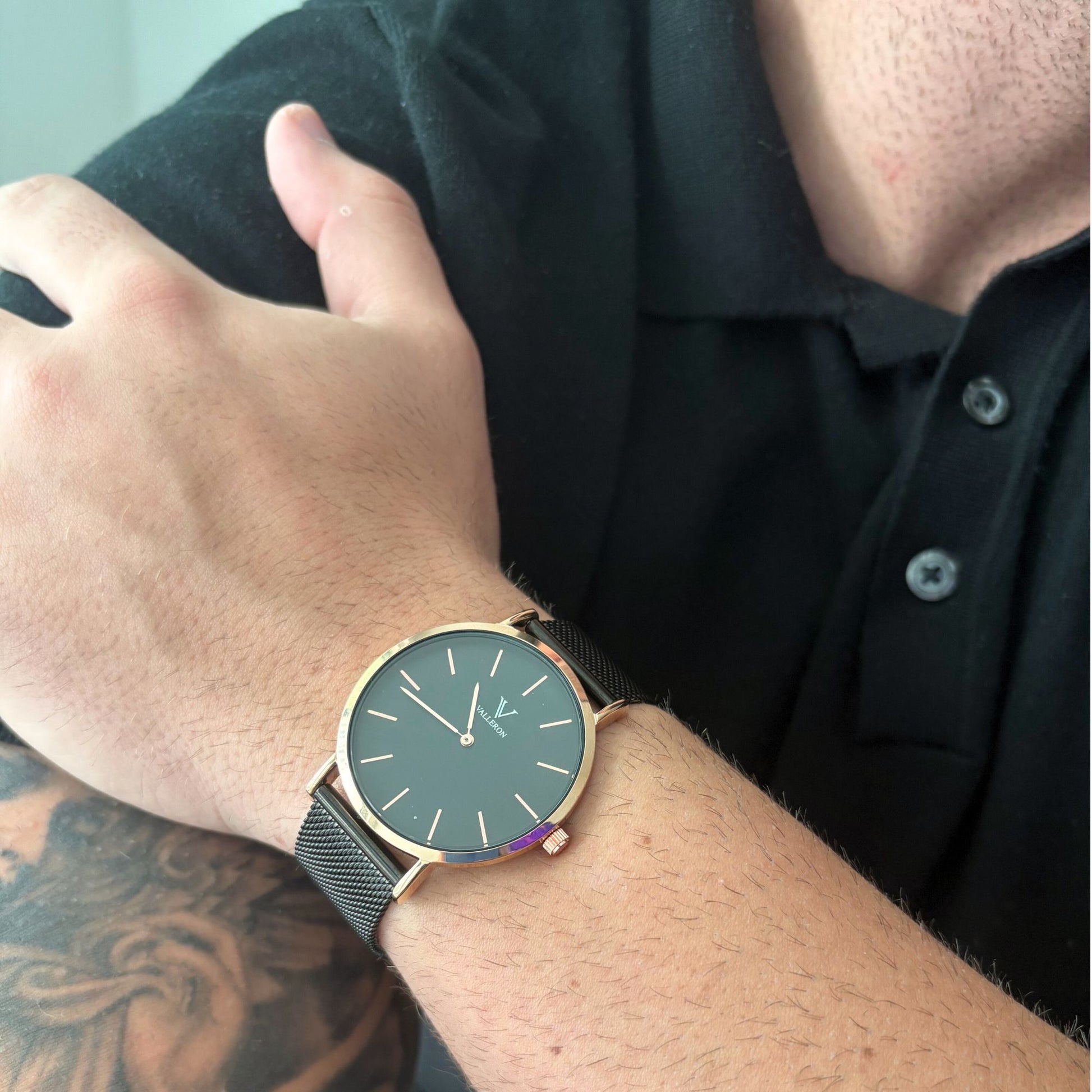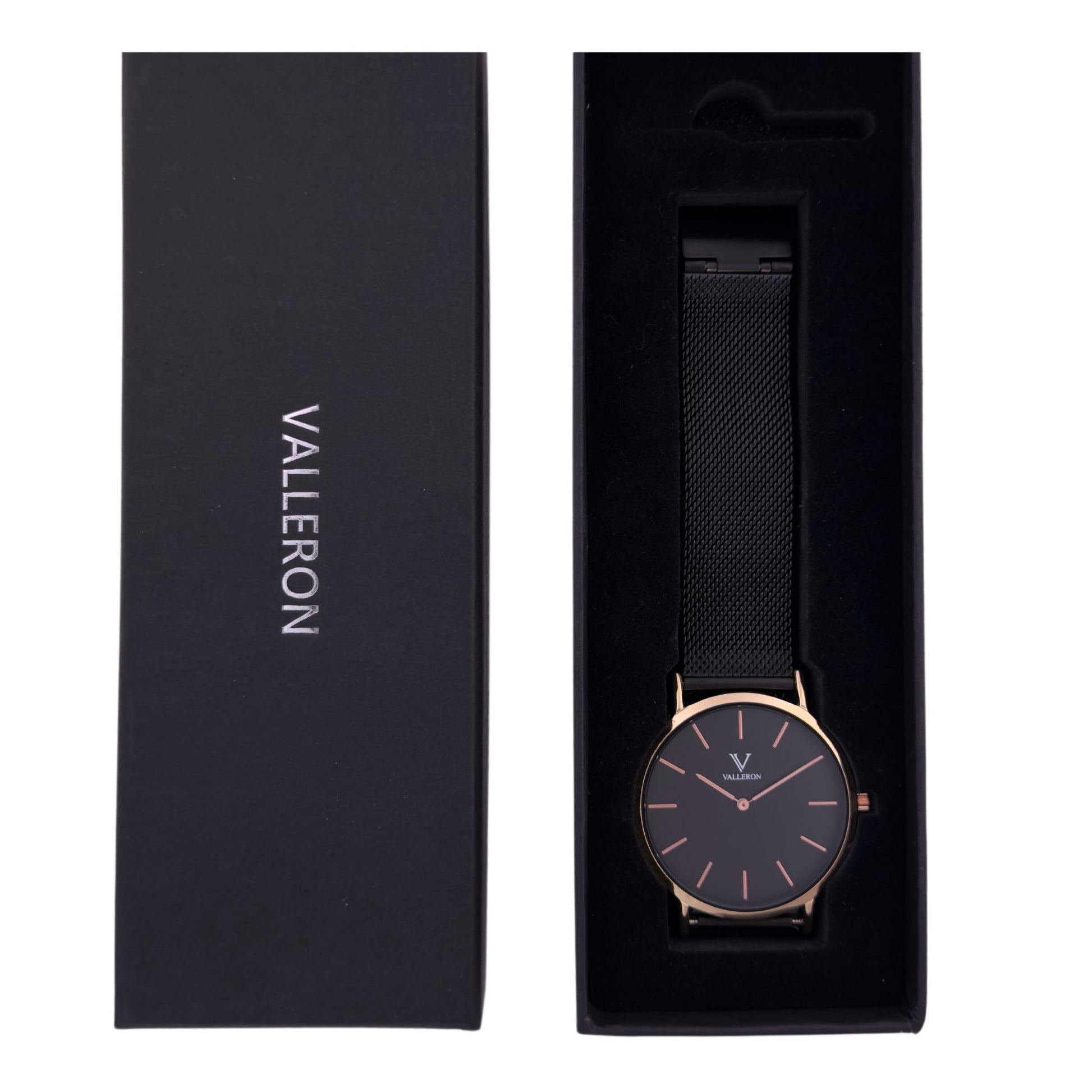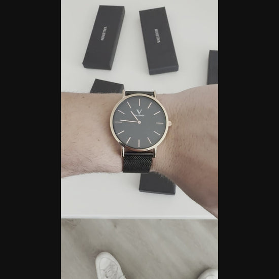 Rennes Black Rose Gold 40mm Valleron Watch with black stainless steel strap, has a diameter of 40mm. The case is made of black metal and the dial is rose gold, with glass made of high-resistance hardened mineral. This watch is ready for you to go from the office to the rooftop party in the blink of an eye.